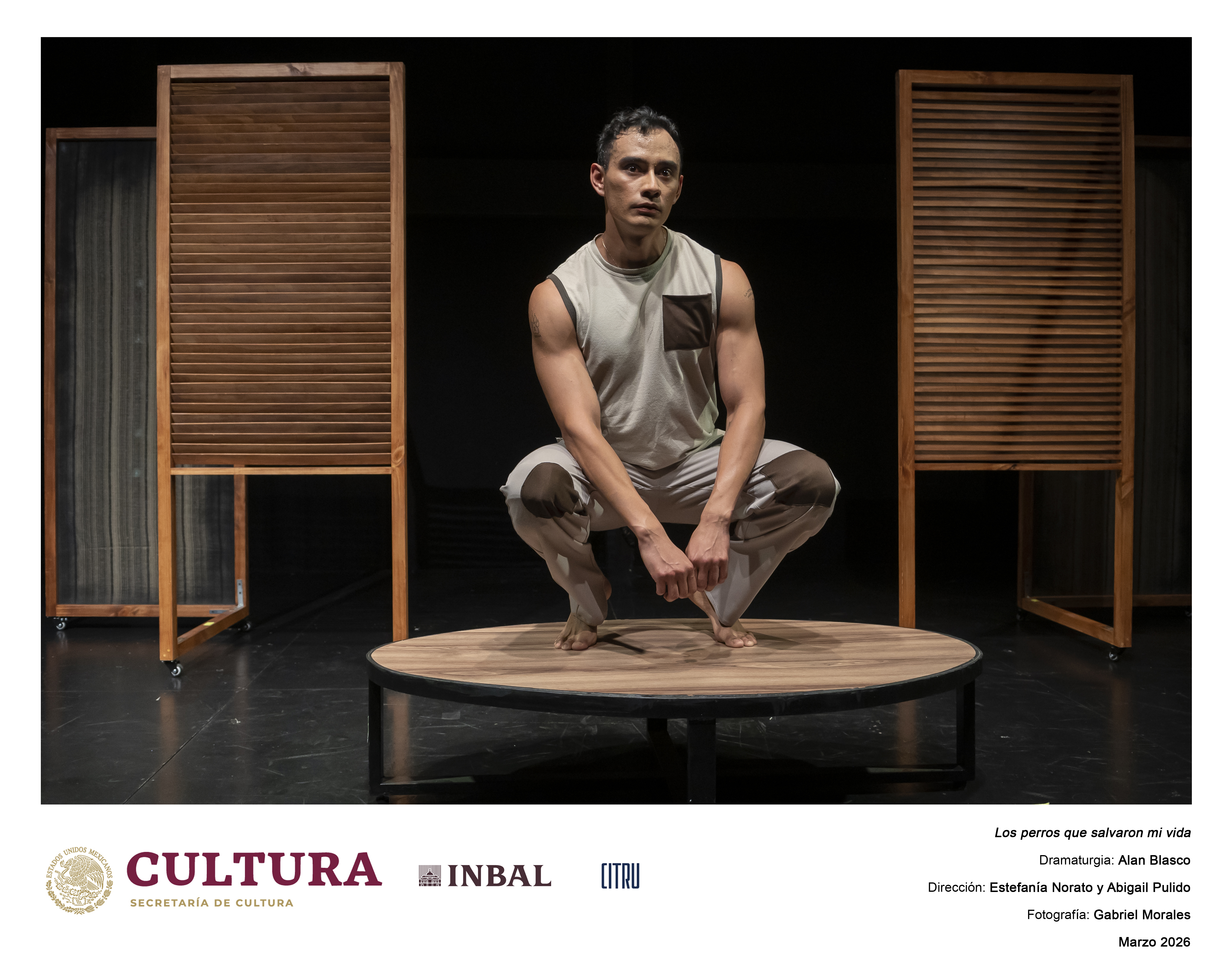 Abstract: OBRA: Los perros que salvaron mi vida. AUTORÍA: Alan Blasco. DIRECCIÓN: Estefanía Norato y Abigaíl Pulido. DISEÑO ESCENOGRÁFICO: Edgar Mora. ESPACIO: El Círculo Teatral. FECHA: 16 de marzo de 2026. REPARTO: Alan Blasco y Ana Tiaré. FOTOGRAFÍA: Gabriel Morales.