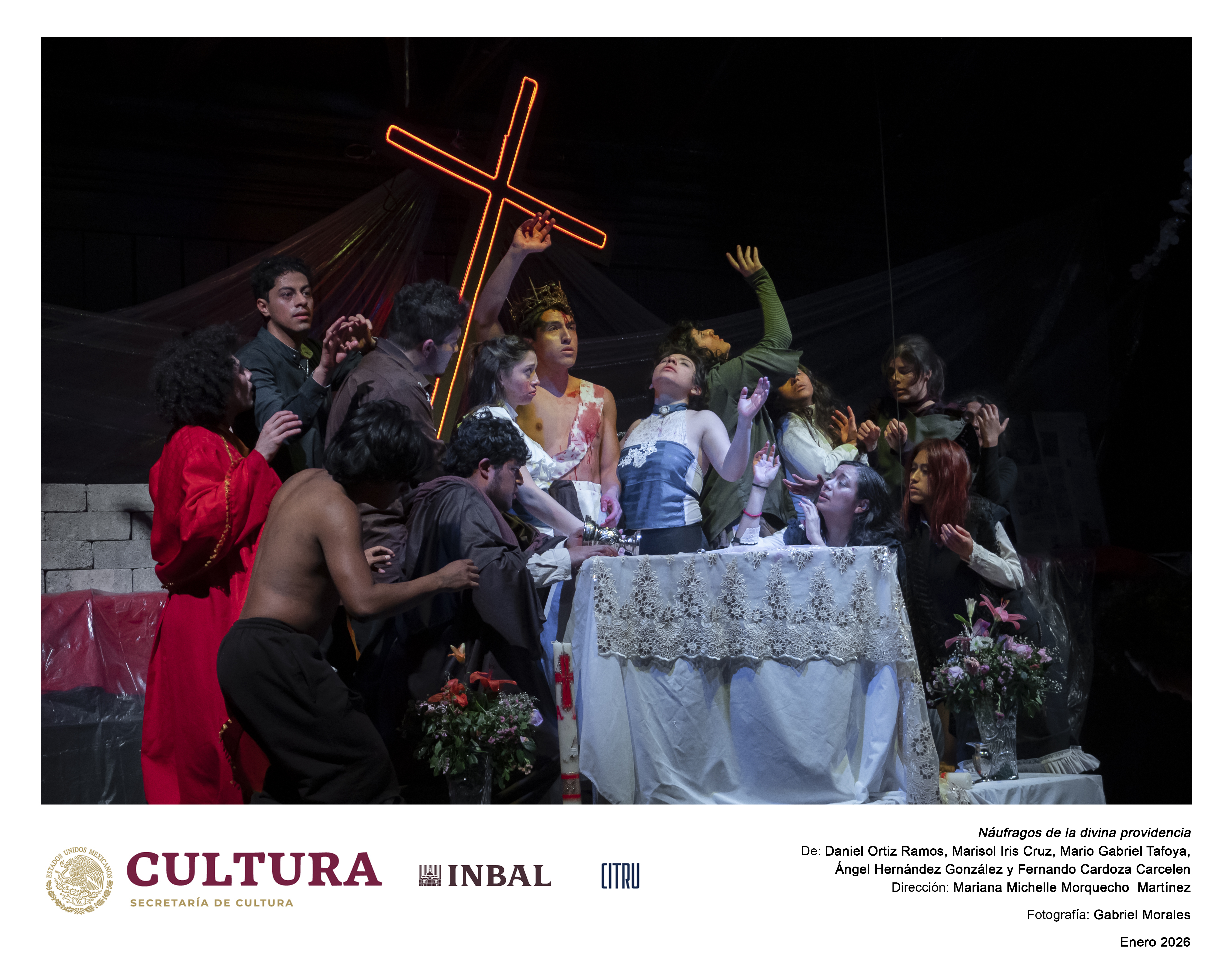 Abstract: OBRA: Náufragos de la divina providencia. AUTORÍA: Daniel Ortiz Ramos, Marisol Iris Cruz, Mario Gabriel Tafoya Vieyra, Ángel Hernández González y Fernanda Cardoza Carcelen. DIRECCIÓN: Mariana Michelle Morquecho Martínez. DISEÑO ESCENOGRÁFICO: Akira Nobara y Marcos Amaya. ESPACIO: Sala Xavier Villaurrutia. FECHA: 18 de enero de 2026. REPARTO: Silvana Cervantes Tapia, Linda Gilary Negrete Alvarez, Leonardo Sánchez Sánchez, Camila Arias Nava, Hector Raziel Zozaya Alaniz, Sofía Quetzalli Jiménez Gutiérrez, Yamilette Arella Gutiérrez Sevilla, Jaqueline Hedzave Pimentel Hernández, Eugenio Nicanor Rodríguez Jiménez, Marisol Iris Cruz, Leonardo Galicia Fernández, Victor David Luna Colunga, Mauricio Sánchez García, Fernanda Cardoza Carcelén y Nahúm Brito Cervantes. FOTOGRAFÍA: Gabriel Morales.