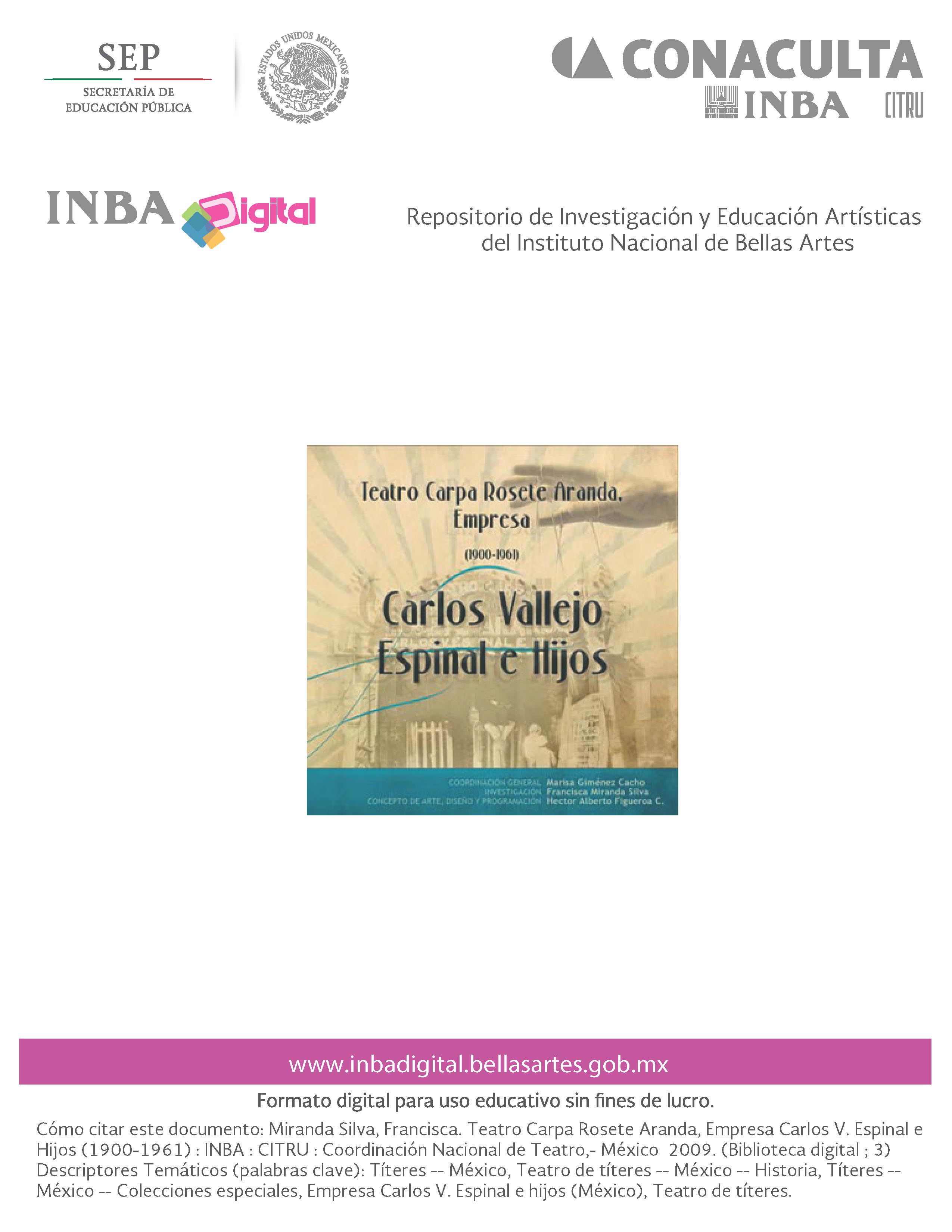 | Citation: | Miranda Silva, Francisca. Teatro Carpa Rosete Aranda, Empresa Carlos V. Espinal e Hijos (1900-1961). INBA/CITRU/Coordinación Nacional de Teatro. México, D.F.: 2009. (Biblioteca digital, 3) |