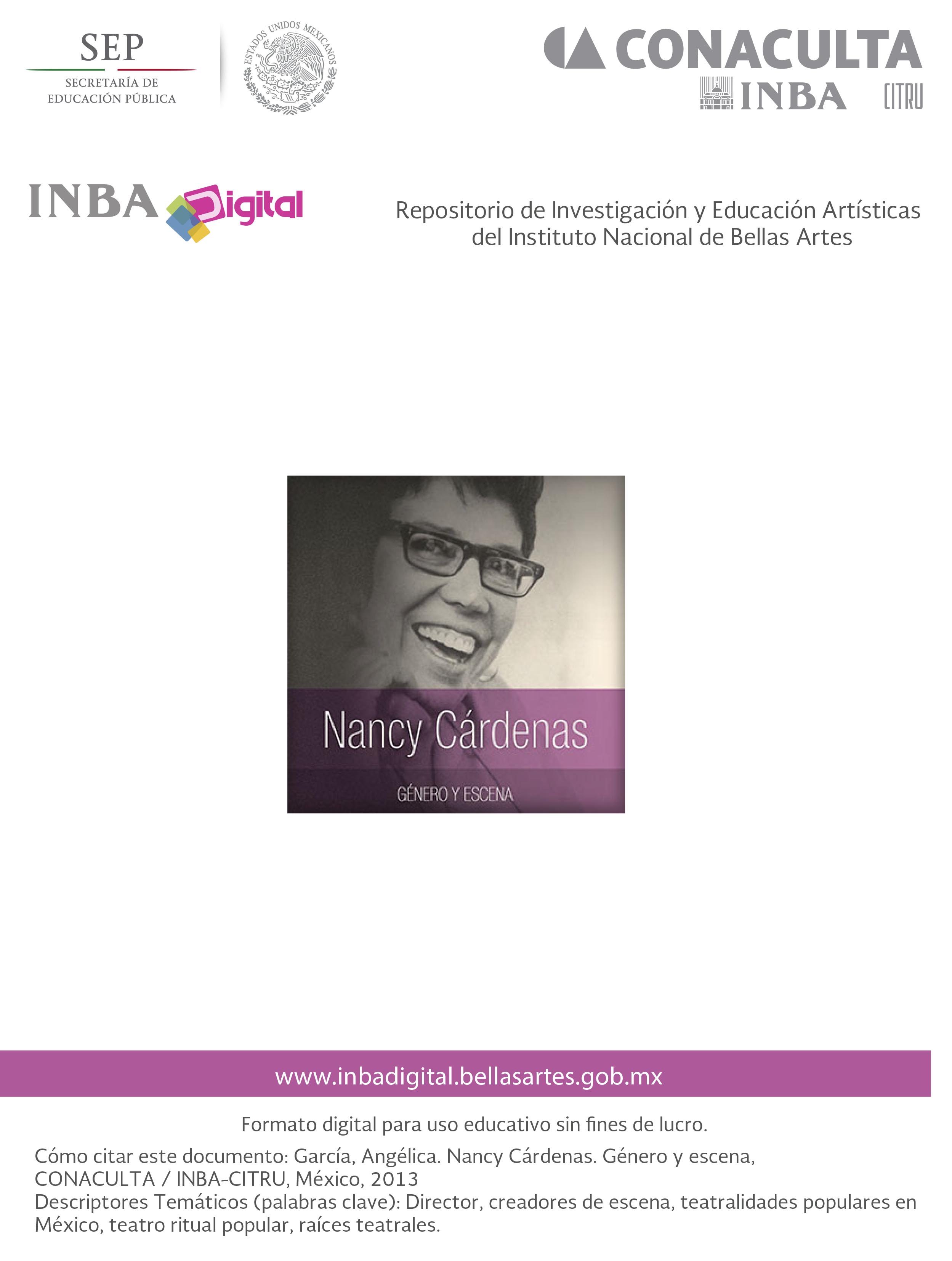 | Citation: | García, Angélica. Nancy Cárdenas. Género y escena, CONACULTA / INBA-CITRU, México, 2013 |