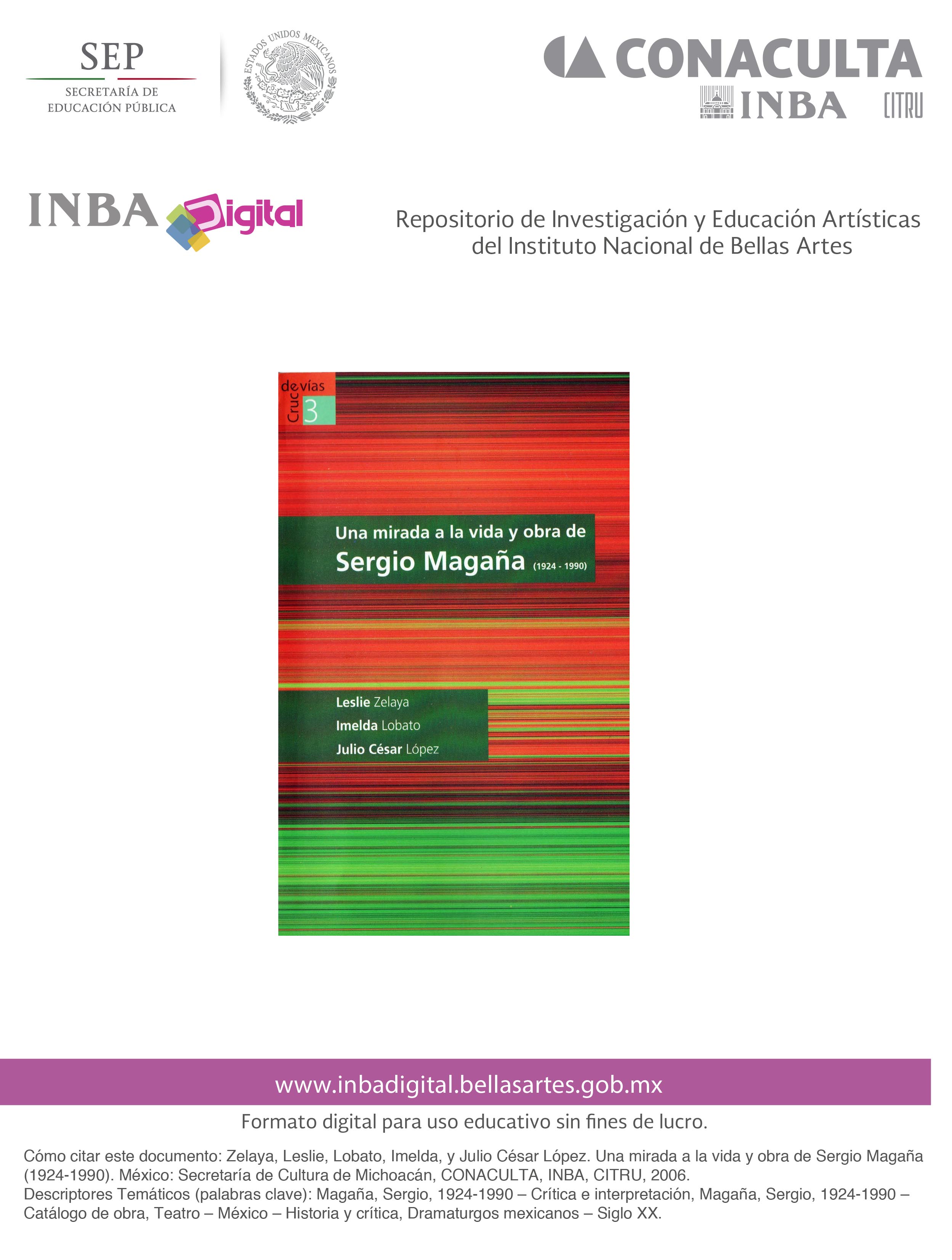 Citation: Zelaya, Leslie, Lobato, Imelda, y Julio César López. Una mirada a la vida y obra de Sergio Magaña (1924-1990). Secretaría de Cultura de Michoacán, CONACULTA, INBA, CITRU, México: 2006