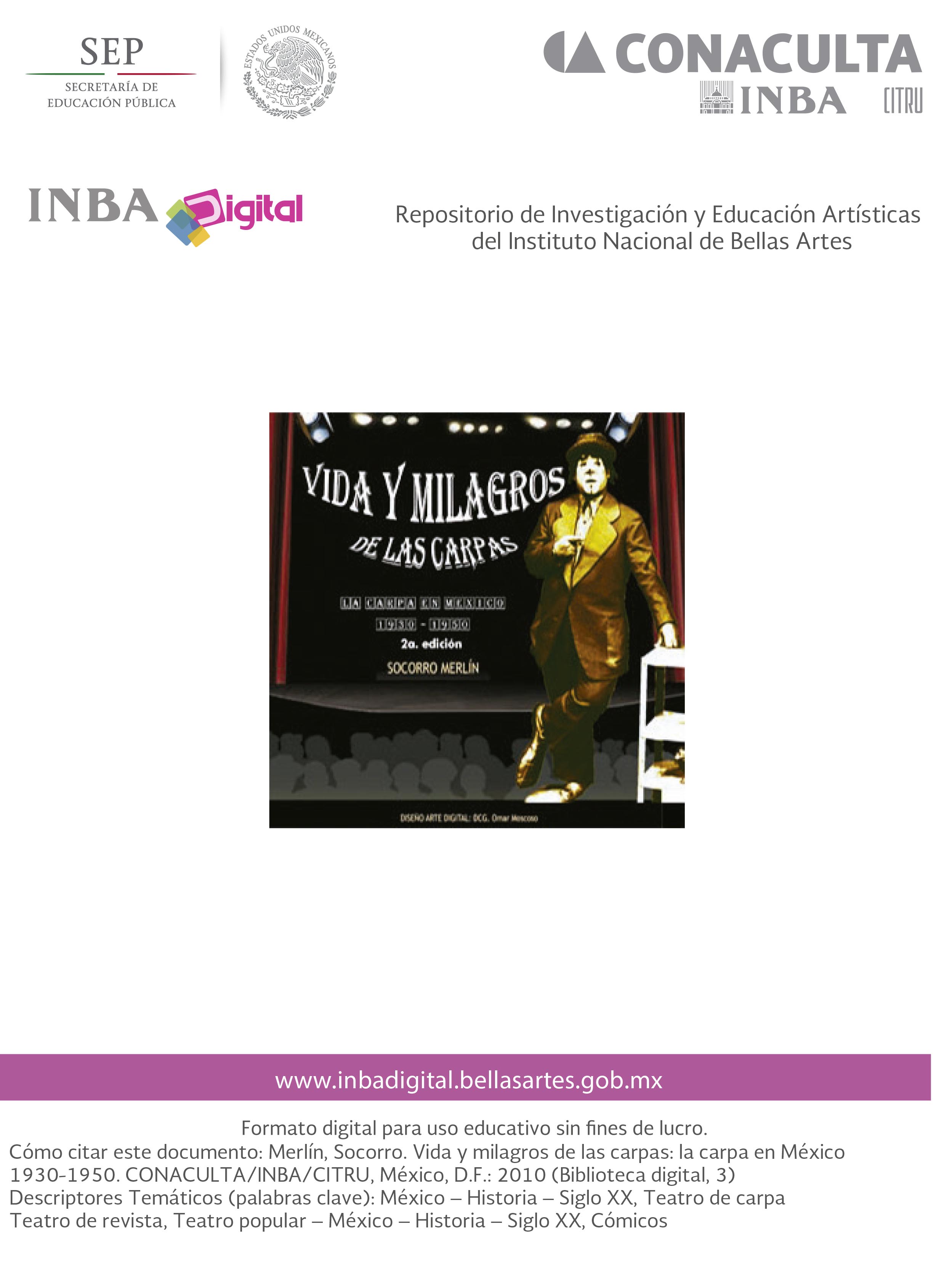 Citation: Merlín, Socorro. Vida y milagros de las carpas: la carpa en México 1930-1950. CONACULTA/INBA/CITRU, México, D.F.: 2010 (Biblioteca digital, 3)