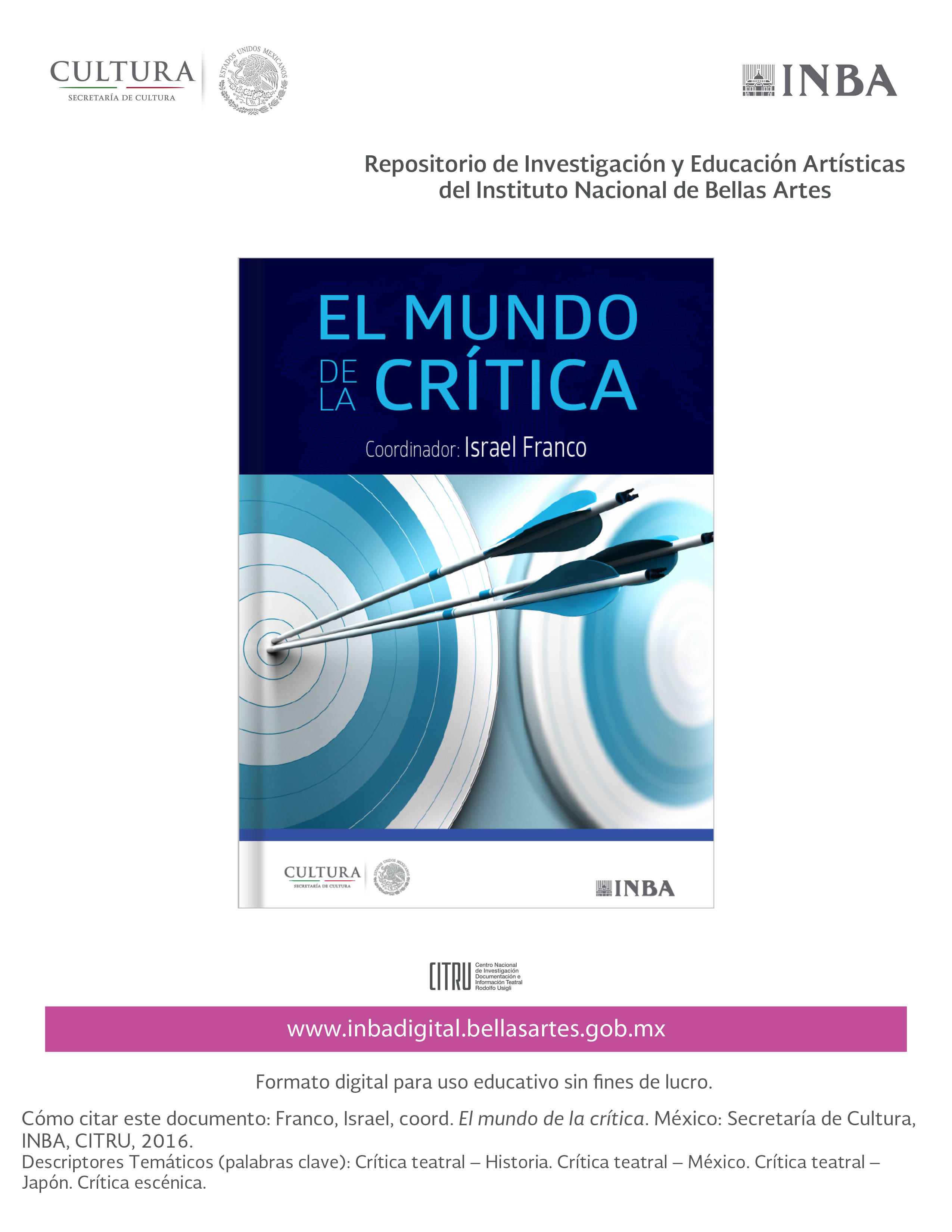 | Citation: | Franco, Israel, coord. El mundo de la crítica. México: Secretaría de Cultura, INBA, CITRU, 2016. |